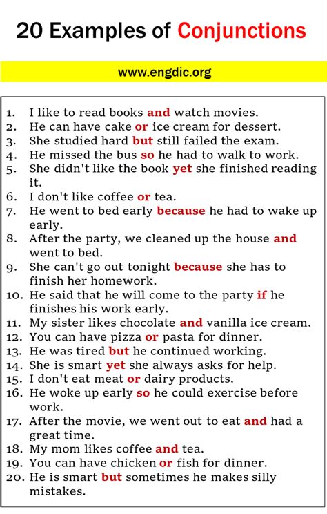 20 examples of conjunction in a sentence with answers